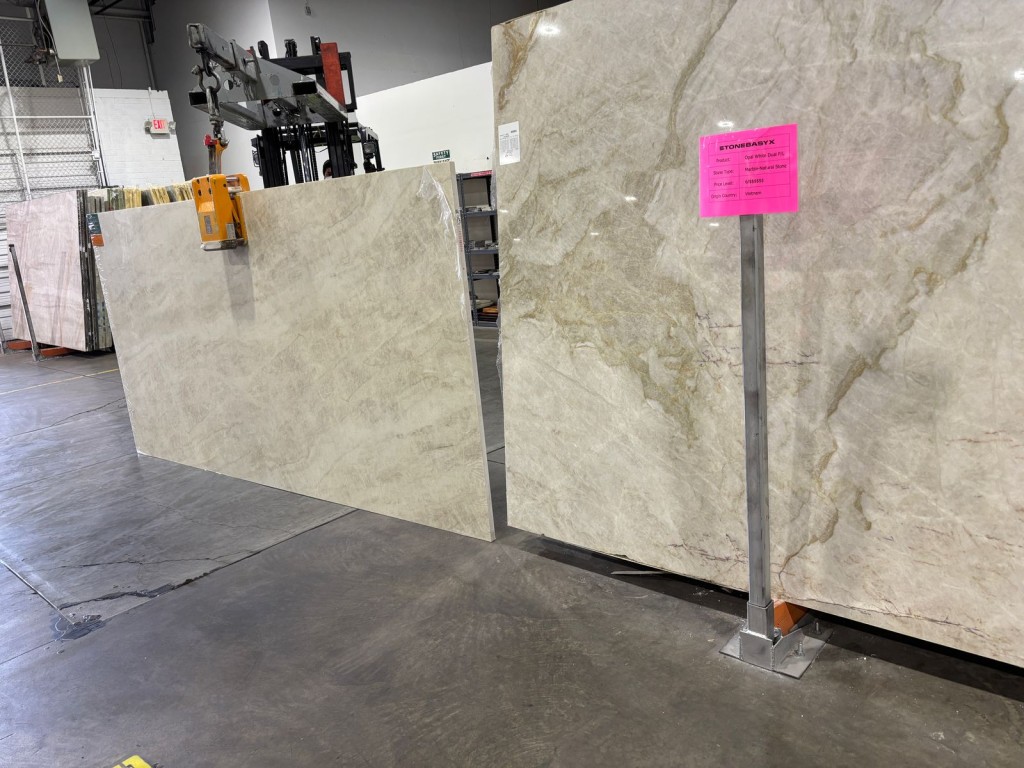 Stone Basyx’s Calacatta Unique stands out with its bold gray veins on a crisp white background, reminiscent of lightning against a clear sky. This surface brings a dramatic flair to any interior design.